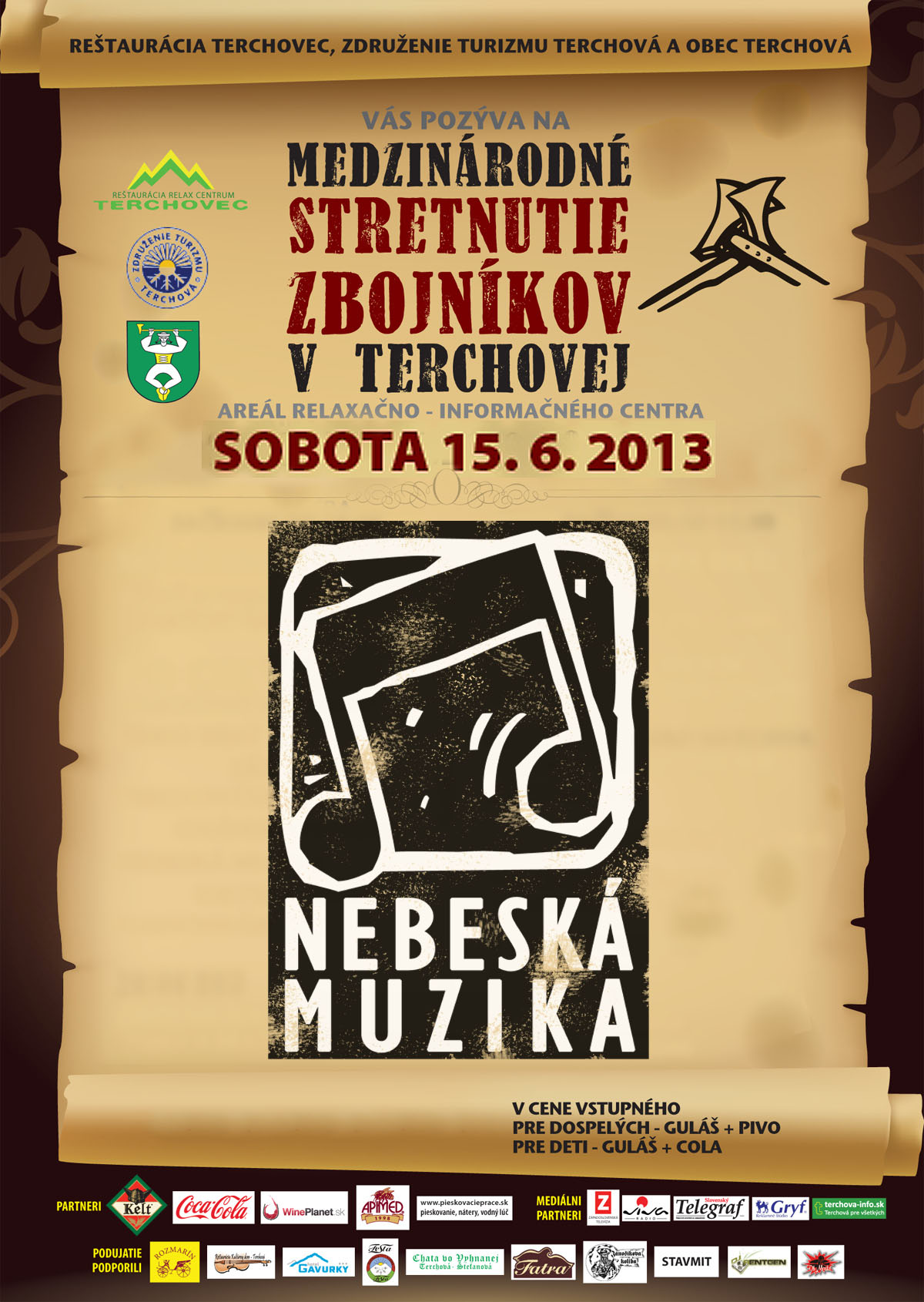 Pozývame vás na zbojnícky celoštátny sviatok, v rámci ktorého bude koncertovať aj Nebeská muzika. Kraj legendárneho Jánošíka čaká v dňoch 14. až 16.6.2013 ďalší ročník skvelého podujatia s názvom Medzinárodné stretnutie zbojníkov v Terchovej. Pri relaxačnom centre Terchovec a v Amfiteátri Nad bôrami si usporiadatelia pre vás pripravili bohatý a zaujímavý program: www.stretnutiezbojnikov.sk Nebeská muzika vám zahrá sláčikový bigbít z Terchovských osád v sobotu o 18:00. Tešíme sa na vás.