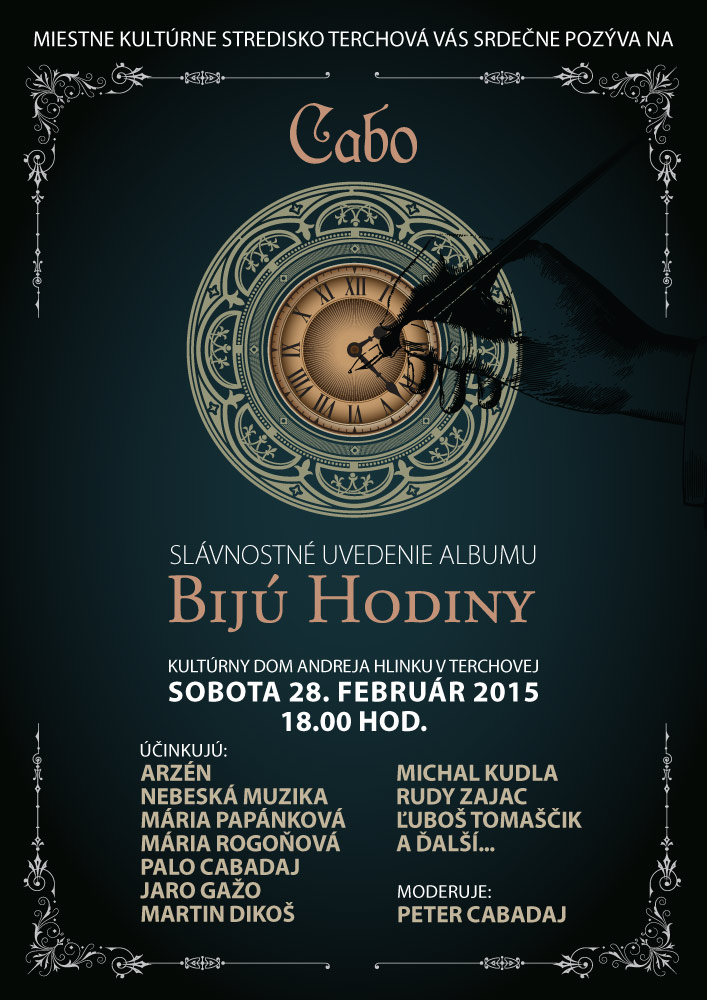 Všetkých srdečne pozývame dňa 28. februára 2015 o 18.00 hod. do Kultúrneho domu Andreja Hlinku v Terchovej na slávnostné uvedenie albumu Bijú hodiny. Za uvedeným projektom stojí vynikajúci terchovský hudobník a skladateľ Pavol Cabadaj, umeleckým menom CABO. Ten pôsobivo zhudobnil verše známych i menej známych slovenských básnikov minulej éry. V skvelom programe sa predstaví okrem nás kapela Arzén a speváci, medzi ktorými nebude chýbať tenor Nebeskej muziky Martin Dikoš.