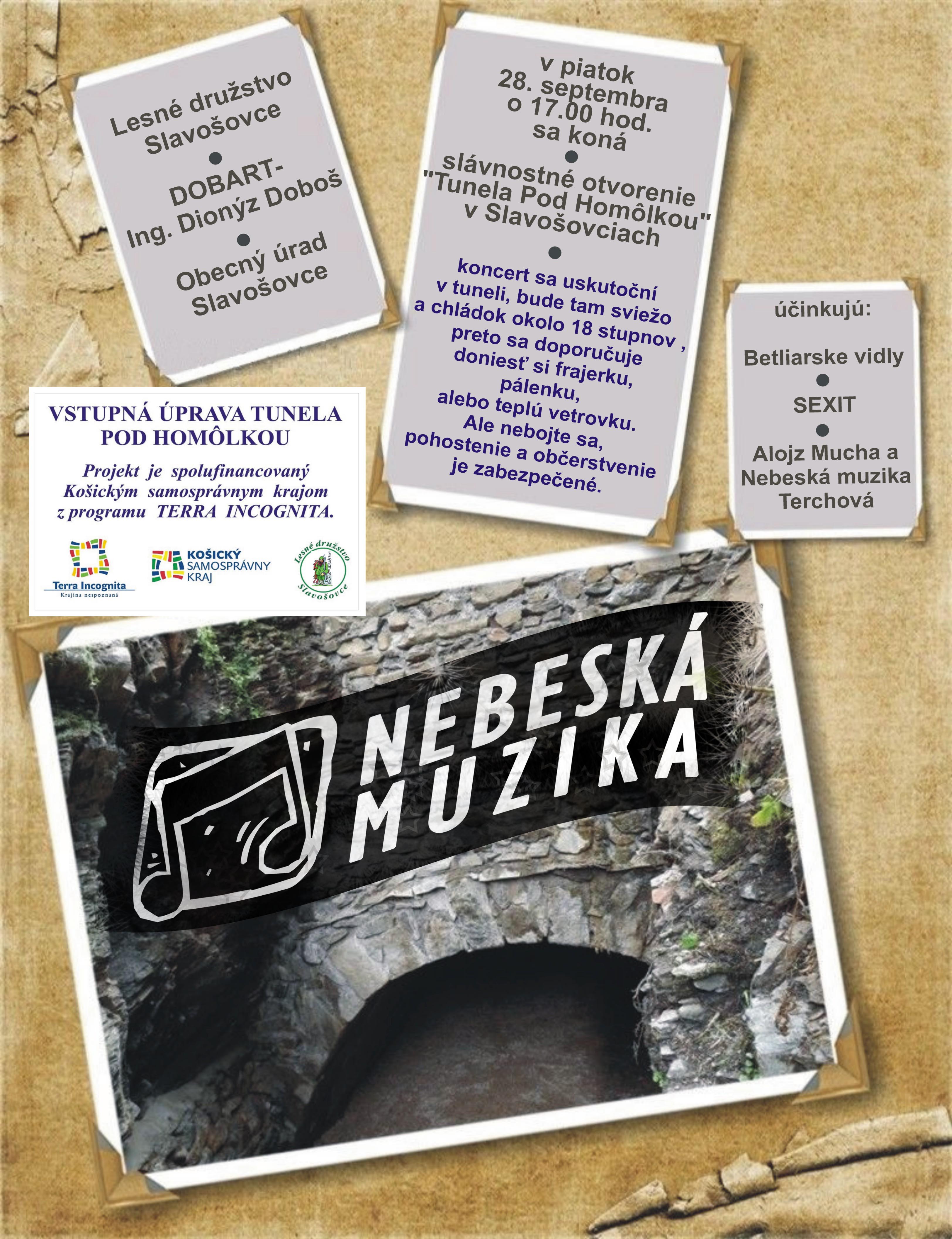 Už ste boli na koncerte v tuneli? Nie? Tak to vás srdečne pozývame v piatok 28. septembra 2012 o 17.00h na slávnostné otvorenie “TUNELA POD HOMÔLKOU” v Slavošovciach. Bude hrať Nebeská muzika a Alojz Mucha, rocková kapela Sexit a country skupina Betliarske vidly. V tuneli je stabilná teplota okolo 18 stupňov, preto sa doporučuje doniesť si frajera/ku, pálenku, alebo teplú vetrovku. Pohostenie a občerstvenie je zabezpečené. Tešíme sa na vás.